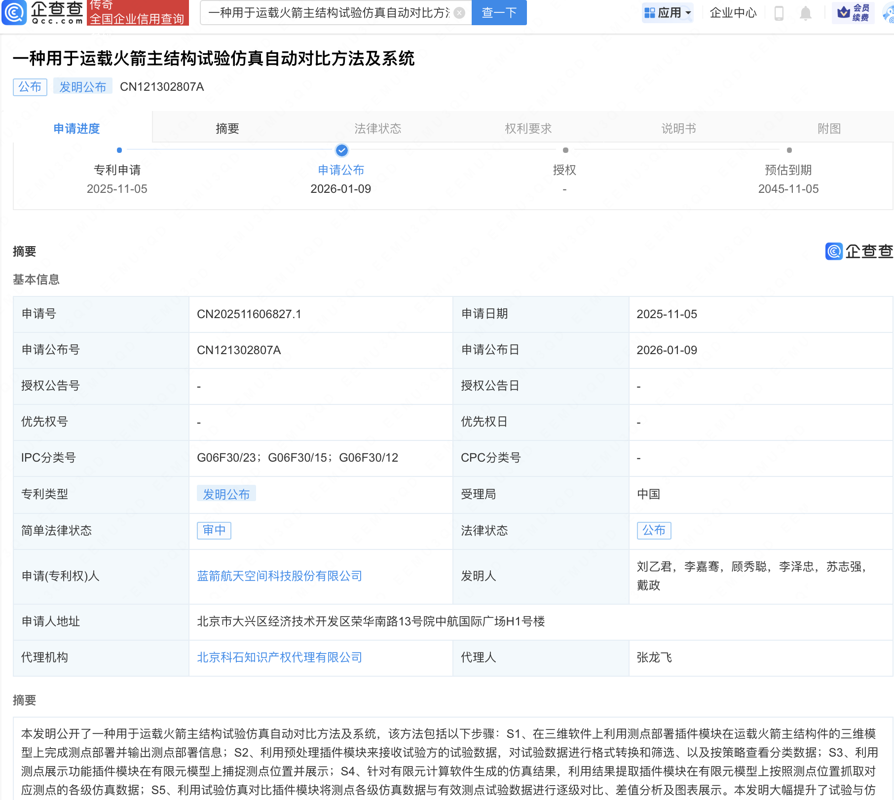 近日,蓝箭航天空间科技股份有限公司“一种用于运载火箭主结构试验仿真自动对比方法及系统”专利公布。企查查专利摘要显示,该方法包括以下步骤:S1、在三维软件上利用测点部署插件模块在运载火箭主结构件的三维模型上完成测点部署并输出测点部署信息;S2、利用预处理插件模块来接收试验方的试验数据,对试验数据进行格式转换和筛选、以及按策略查看分类数据;S3、利用测点展示功能插件模块在有限元模型上捕捉测点位置并展示;S4、针对有限元计算软件生成的仿真结果,利用结果提取插件模块在有限元模型上按照测点位置抓取对应测点的各级仿真数据;S5、利用试验仿真对比插件模块将测点各级仿真数据与有效测点试验数据进行逐级对比、差值分析及图表展示。本发明大幅提升了试验与仿真对比分析的工作效率。